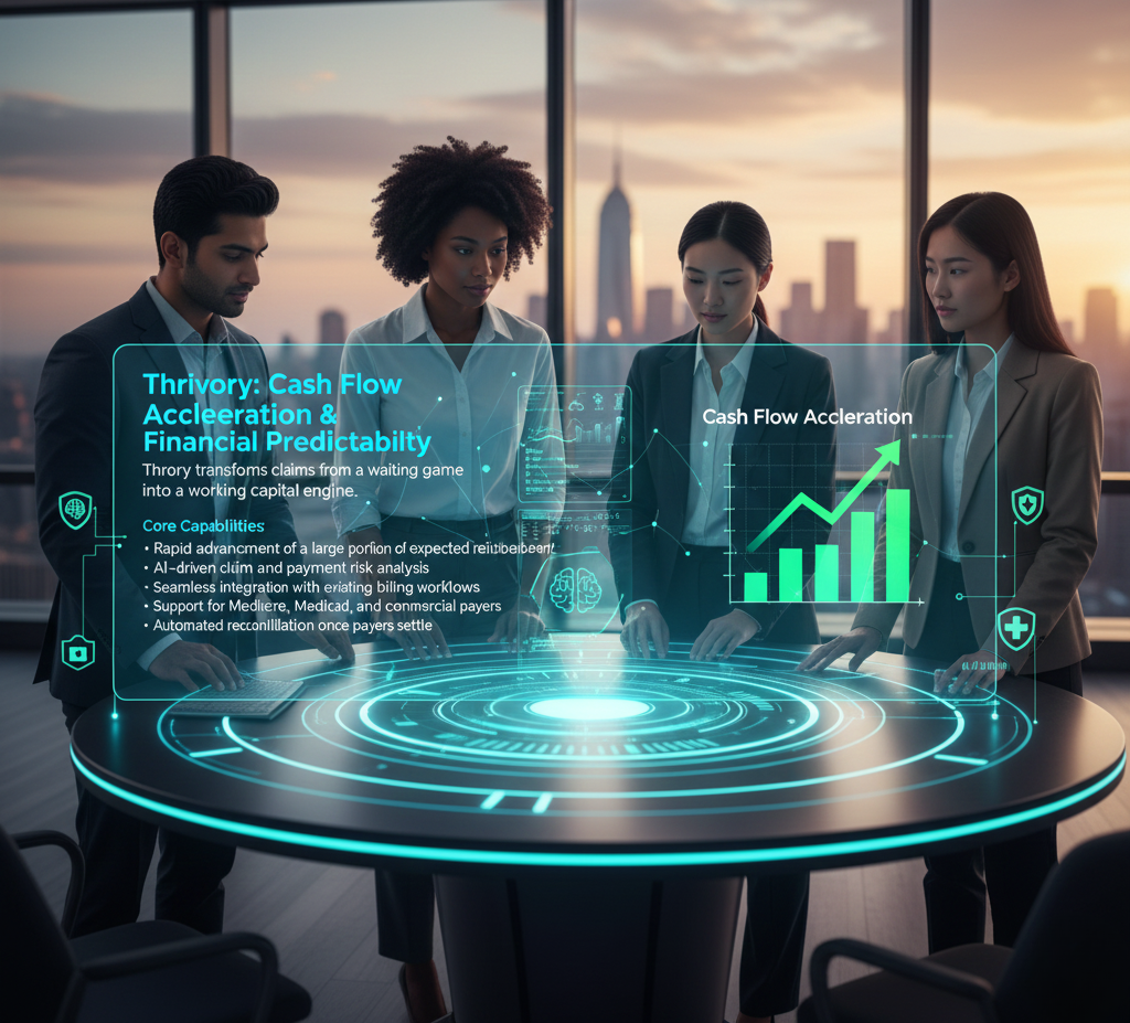 Thrivory advances funds on submitted claims, shortening the time between service and payment.